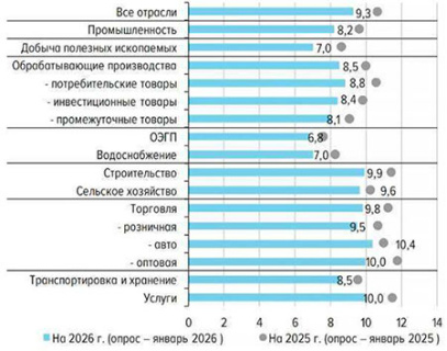 «При формировании бизнес-планов на 2026 год участники мониторинга в среднем исходят из годовой инфляции 9,3%», – сообщил в своем мониторинге ЦБ. Наиболее высокие ожидания на 2026 год, судя по бизнес-планам, в торговле, строительстве и сфере услуг – инфляция в среднем примерно 10%.