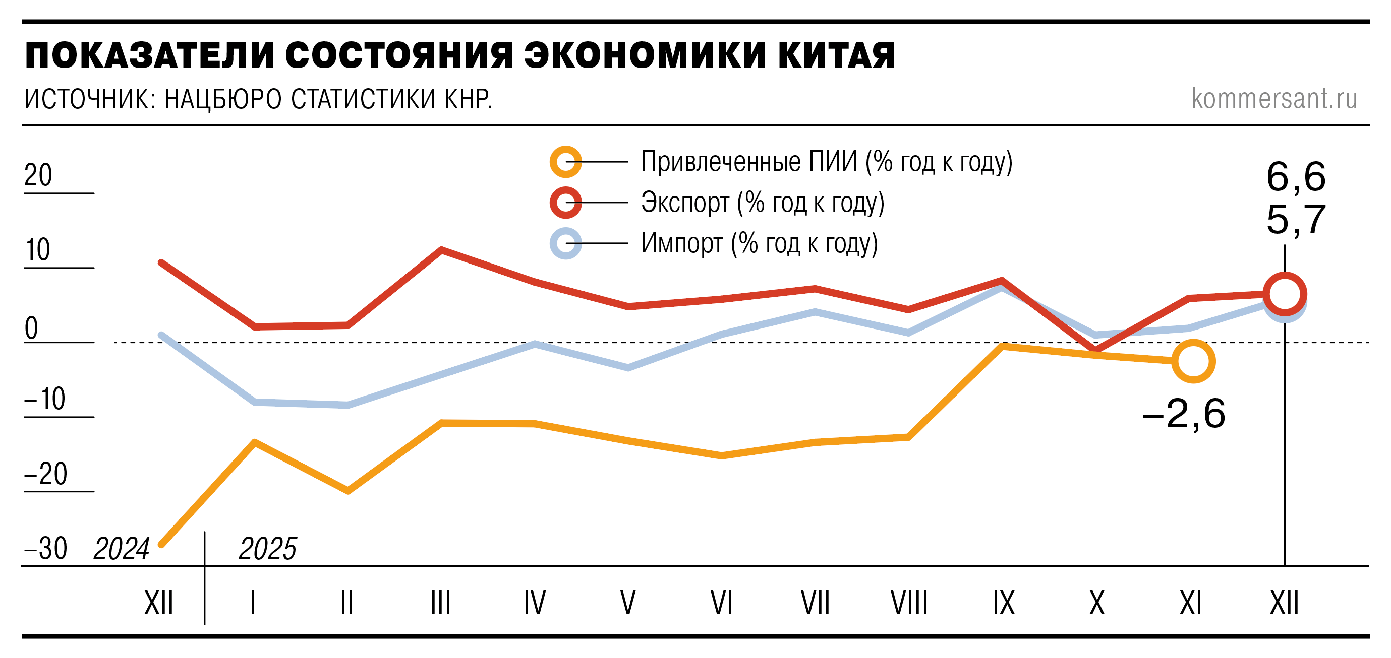 Отчасти слабостью спроса в КНР объясняется первое за пять последних лет сокращение китайско-российской торговли: товарооборот в 2025 году составил $228,1 млрд, что на 6,9% меньше, чем в 2024 году. Среди причин проседания импорта из РФ (на 3,9%, до $124,8 млрд) — снижение цен на нефть, а также сложности с расчетами. Экспорт Китая в Россию за год также сократился — на 10,4%, до $103,3 млрд. В 2025 году и китайская, и российская сторона неоднократно заявляла, что многие сегменты российского рынка уже насыщены китайской продукцией (см. “Ъ” от 20 августа 2025 года), «торговая экспансия» Китая в РФ себя фактически исчерпала и далее рост оборотов, видимо, будет более спокойным.